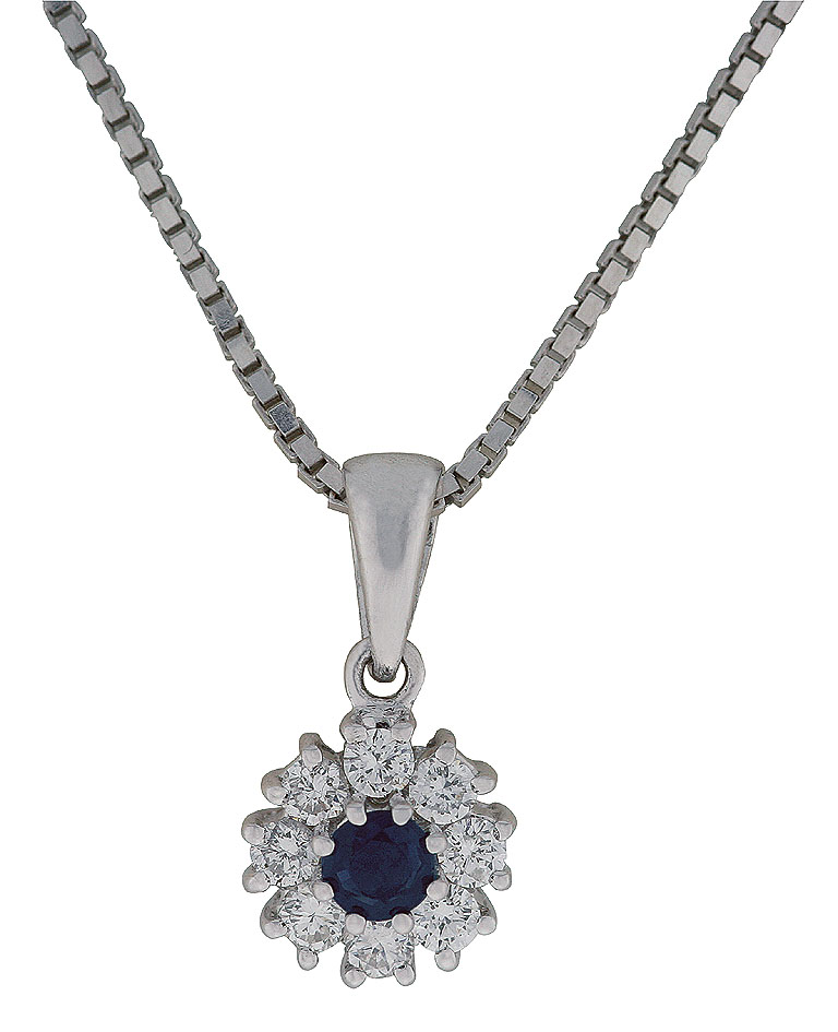Diamantsmykke i hvitt gull 14k med 8 diamanter. Totalt 0,30 carat tw/si diamanter + safir. Diameter ca. 8mm. (Prisen er uten kjede).