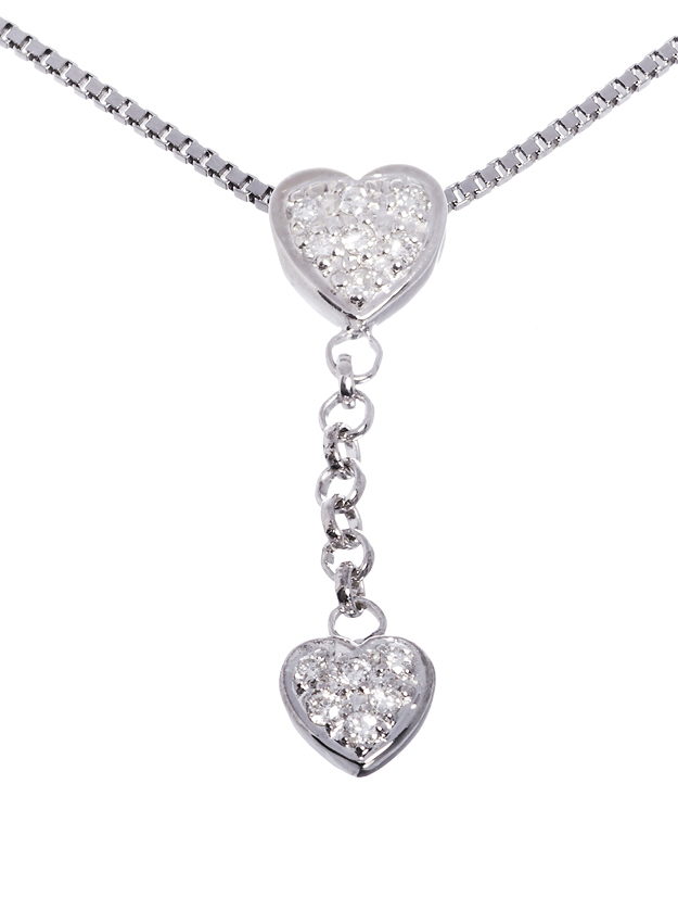 Diamantsmykke i hvitt gull med 0,15 carat tw/si diamanter. To diamanthjerter. Lengde: 2,5 cm. Prisen er uten kjede.