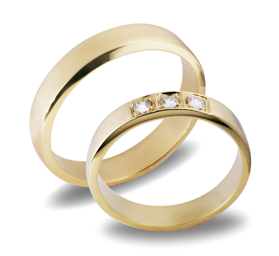 Tidløse vakre ringer i polert 14 karat gult gull med lett avrundet fasong utvendig og innvendig. Dameringen er fattet med tre diamanter, størrelse 0,05 ct i kvalitet TW/SI. Bredden på ringene er ca. 3,5mm. Ringen kan om ønskelig fattes med flere diamanter ved en senere anledning. Gravering er inkl. i prisen. Gratis frakt.