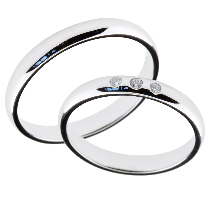 Forlovelsesringer/gifteringer i 14 karat hvitt gull med tre diamanter i dameringen. Ringenes bredde er 3 mm, tykkelse ca. 1,5 mm, fasongen er avrundet utvendig og lett avrundet innvendig. Diamantene har størrelse 0,01 ct. i kvalitet TW/SI. Pris pr. par. Gratis frakt og gravering. Sendes med diamantsertifikat.