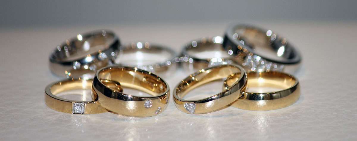 Forlovelsesringer/gifteringer i 14 karat hvitt gull med fem diamanter i dameringen. Ringenes bredde er 5 mm, tykkelse ca. 1,6 mm, fasongen er avrundet utvendig og lett avrundet innvendig. Diamantenes størrelse er 0,02 ct. totalt 0,10 i kvalitet TW.SI. Pris pr. par. Gratis frakt. Gravering er inkludert i prisen. Leveres med diamantsertifikat.