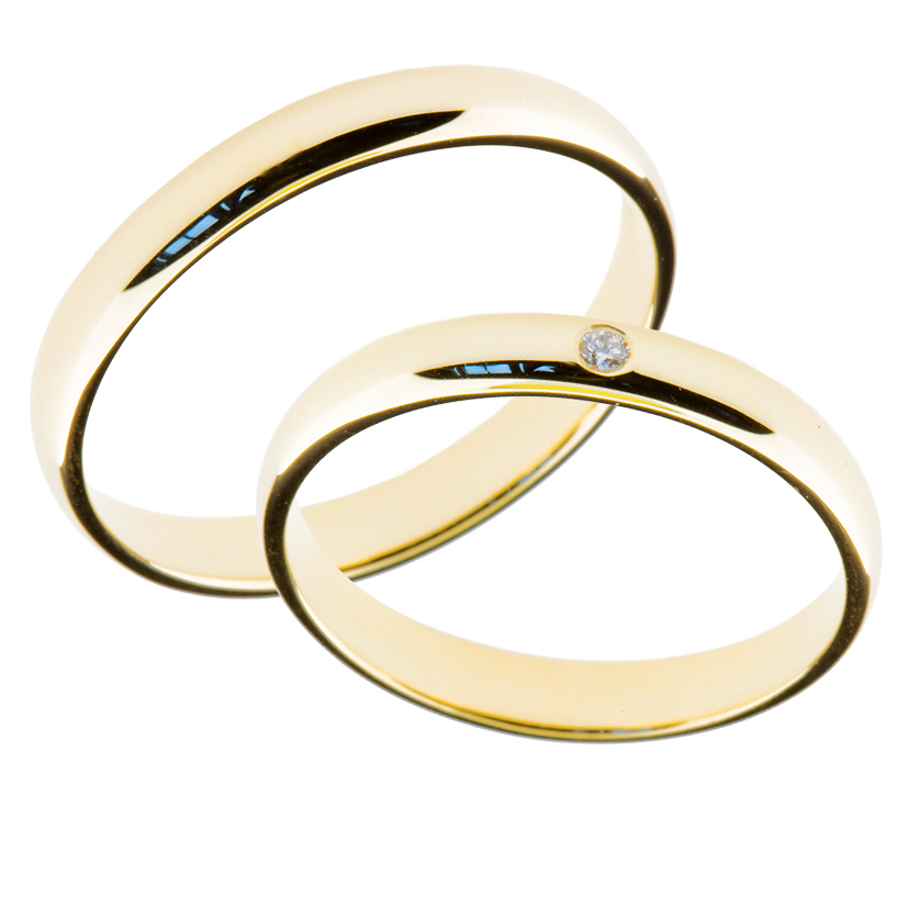 Forlovelsesringer/gifteringer i 14 karat gult gull med en diamant i dameringen. Ringenes bredde er 3 mm, tykkelse ca. 1,5 mm, fasongen er avrundet utvendig og lett avrundet innvendig. Diamanten har størrelse 0,01 ct. i kvalitet TW.SI. Pris pr. par. Gratis frakt.
